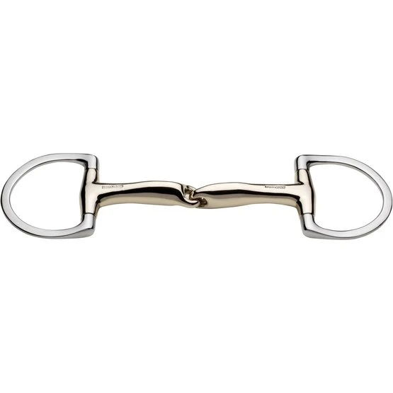 Eingelenkige Novo-Contact-Trense mit D-förmigen Ringen. 16 mm dick. 11,5 cm breit. Material Sensogan mit Edelstahlringen. Regt Speichelproduktion, Kautätigkeit und Gebissannahme an. Das ovale Mundstück des de novocontact vergrößert die Angriffsfläche auf der Zunge für eine sanfte, klare Wirkung. Geeignet für Pferde, die Schwierigkeiten haben, das Gebiss zu nehmen und daher schnell hinter die Zügel kommen. Die D-Ringe bieten seitlichen Halt beim Lenken und eine direkte Wirkung der Zügelhilfen durch die festen Ringe.