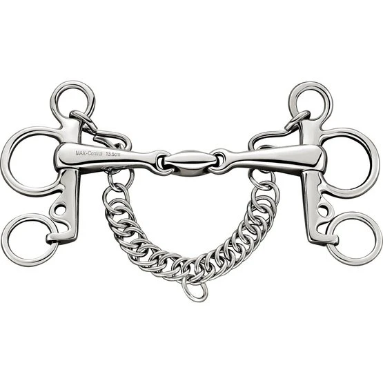 Doppelt gebrochene MAX Control D-Trense. 16 mm dick. 12,5 cm breit. Material: Edelstahl. Das Aussehen eines MAX-Steuergebisses ist fast identisch mit einem normalen Doppelgelenkgebiss. Bei den MAX-Steuerbits blockiert das Mundstück jedoch ab einem bestimmten Druck und verwandelt sich in eine ungebrochene Stange. Wenn dieser Druck nachlässt, weil sich die Hand des Reiters entspannen kann, kehrt die Funktion eines normalen doppelt gebrochenen Gebisses zurück. Dies gibt Ihnen mehr Kontrolle, wenn ein Pferd sehr stark wird. Die Hebelwirkung des Pelham-Gebisses kann durch die Befestigung der Zügel bestimmt werden. Empfohlen zur Verwendung mit Pelham-Trägern. Die Kinnkette begrenzt zu viel Druck hinter den Ohren. Zügelhilfen kommen direkt durch die kurzen Schenkel.