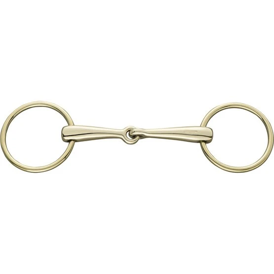 Eingelenkige Wassertrense. 18 mm dick. 12,5 cm breit. Material Sensogan mit Aurigan-Ringen. Regt die Speichelproduktion, die Kautätigkeit und damit die Gebissannahme an.