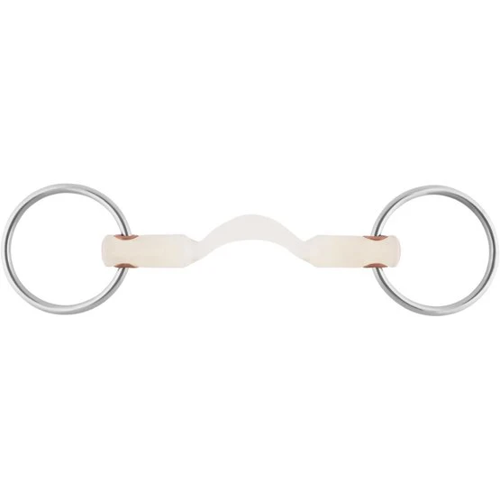 Ungebrochene Wassertrense mit Zungenbogen Aus antiallergischem thermoplastischem Material, 20 mm dick. 12,5 cm breit. Freundlich zu Zunge und Mund. Hält die Zungenmitte frei von Druck. Geeignet für starke Pferde oder Pferde, die dazu neigen, die Zunge nach oben zu ziehen.Härte: normal
