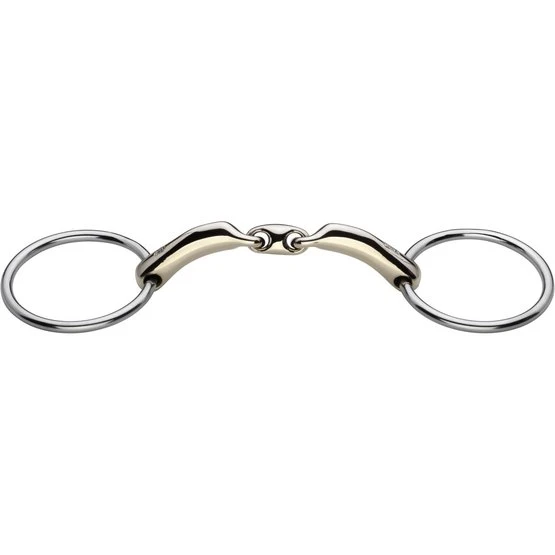 Doppelt gebrochene novocontact Wassertrense. 16 mm dick. 11,5 cm breit. Material Sensogan mit Edelstahlringen. Regt Speichelproduktion, Kautätigkeit und Gebissannahme an. Das ovale Mundstück des de novocontact vergrößert die Angriffsfläche auf der Zunge für eine sanfte, klare Wirkung. Geeignet für Pferde, die zum Hängenbleiben neigen, aber empfindlich im Maul sind.