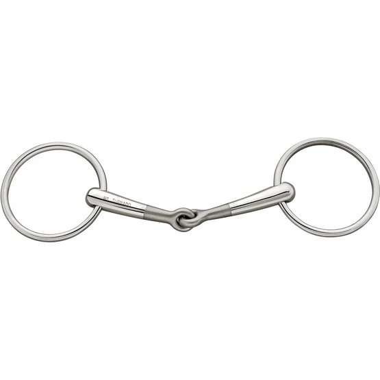 Eingelenkige Turnado-Wassertrense. 16 mm dick. 11,5 cm breit. Material Edelstahl mit Edelstahlringen. Das innovative Zentrum der Turnado-Trense ist um 45 Grad nach vorne gedreht und auf beiden Seiten gleich. Dies ermöglicht einen gleichmäßigen Druck über die Zungenränder und diese Trense bekommt niemals den ‚Nussknacker-Effekt‘ im Gaumen. Freundlich zur Zunge. Der mittlere Teil des Mundstücks ist leicht sandgestrahlt, so dass diese Trense sofort zwischen den regulären einfach gebrochenen Trensengebissen hervorsticht. Diese hat keine Funktion und verschwindet nach und nach während des Gebrauchs.