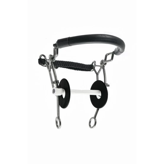 Dieses Kieferstück ist eine Kombination aus einem Hackamore und einem Gebiss. Die Hackamore-Kombi ist ein Hebelbackenstück, das Druck auf Nase, Kinn und im Mund ausübt. Je länger die Schere der Hackamore, desto stärker die Wirkung. Diese Kombination mit langer Schere wirkt schärfer als die kurze Hackamore-Kombination. Diese Gebisse werden oft bei sehr einsatzfreudigen Pferden im Parcours eingesetzt. Aufgrund der Hebelwirkung ist dies ein ziemlich scharfes Gebiss und daher nicht für den unerfahrenen Fahrer geeignet.