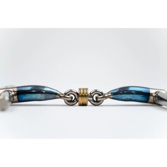 Das Mundstück mit Messing-Ringen ist eine Variante des doppelt gebrochenen Gebisses. Die Ringe in der Mitte regen das Pferd zum Spielen mit dem Gebiss an. Dadurch wird die Zungenaktivität erhöht, so dass das Pferd mehr Speichel produziert und die Kiefer sich mehr entspannen können.