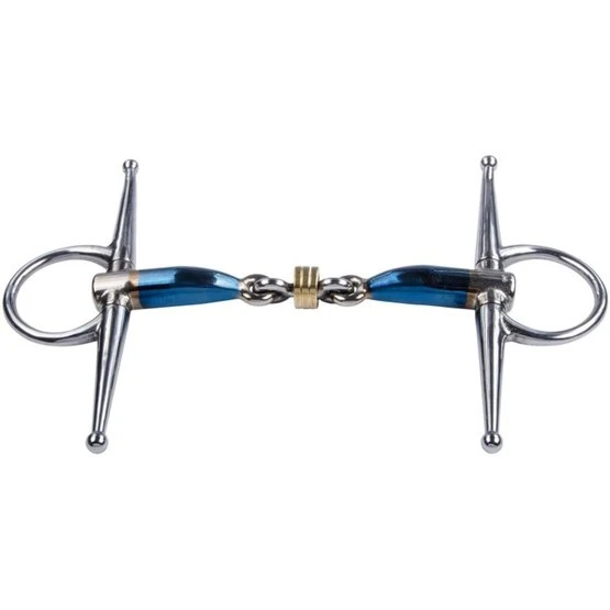Das Mundstück mit Messing-Ringen ist eine Variante des doppelt gebrochenen Gebisses. Die Ringe in der Mitte regen das Pferd zum Spielen mit dem Gebiss an. Dadurch wird die Zungenaktivität erhöht, so dass das Pferd mehr Speichel produziert und die Kiefer sich mehr entspannen können.