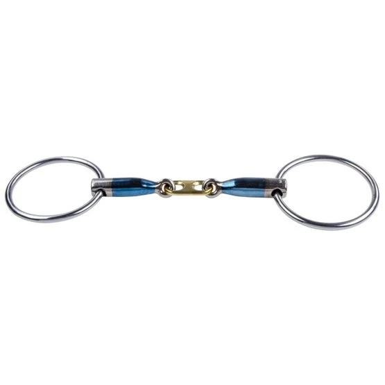 Das Mundstück mit Messing-Ringen ist eine Variante des doppelt gebrochenen Gebisses. Die Ringe in der Mitte regen das Pferd zum Spielen mit dem Gebiss an. Dadurch wird die Zungenaktivität erhöht, so dass das Pferd mehr Speichel produziert und die Kiefer sich mehr entspannen können.