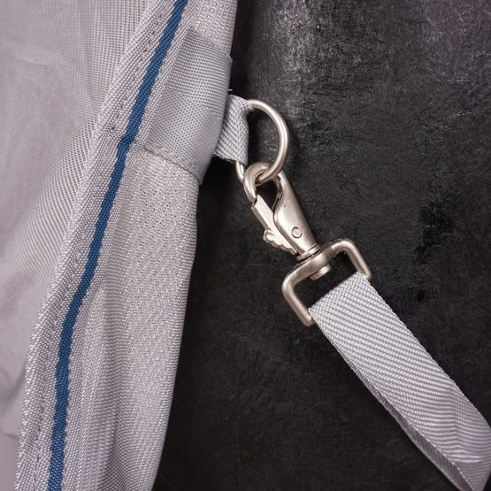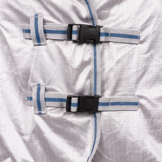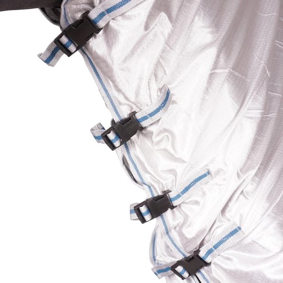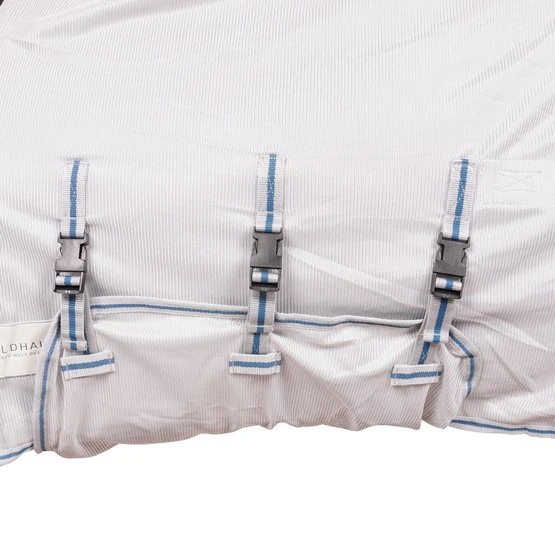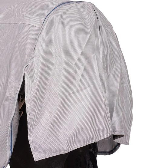 Kombination aus Ekzemer- und Fliegendecke. Halsteil und Schulterbereich aus elastischem, atmungsaktivem Funktions-Faserstoff. Fliegendecke aus feinmaschigem Gewebe mit Bauch- und Schweiflatz zum Schutz vor lästigen Insekten. Doppelter Frontverschluss, extra große Gehfalte, Schweifkordel und Beinschnüre sorgen für einen guten Sitz.