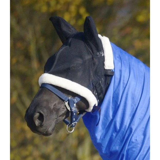 Effektive Schutzmaske, die das Sehen des Pferdes nicht beeinträchtigt. Mit Ohrenschutz, weichem Teddy-Fleece Polster und elastischem Verschluss.