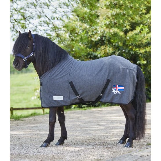 Weiche Fleecedecke mit Islandpferde Stickerei in den klassichen Islandfarben mit Frontverschluss, Kreuzgurten und Schweifkordel.