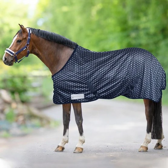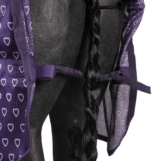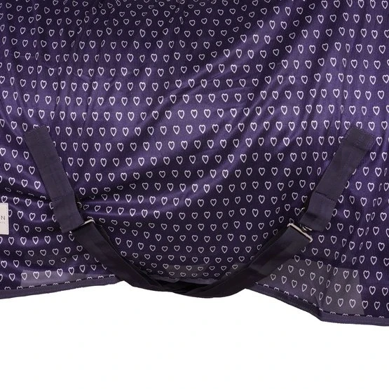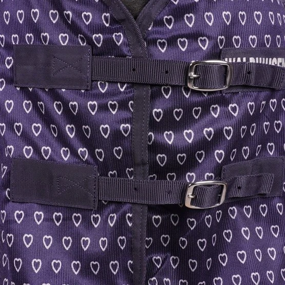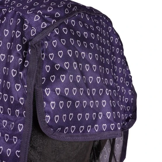 Leichte Fliegendecke mit Herzchenprint, mit doppeltem Frontverschluss, Kreuzgurten mit Elastik und Schweifkordel. Passend zu allen Artikeln der Waldhausen Lucky Heart Serie.