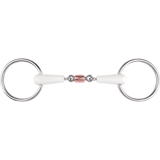 Das hochwertige Thermoplastmaterial ist sehr gut verträglich und regt die Kautätigkeit an. Der Kontakt zum Pferdemaul wird verfeinert und fördert so die Zufriedenheit und Leistungsbereitschaft ihres Pferdes. Die Ringe sind aus Edelstahl, ebenso die im inneren der Gebisse befindlichen Stahlseelen. Achten Sie auf die korrekte Lage des Gebisses damit dieses nicht zerbissen werden kann.