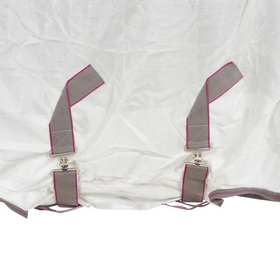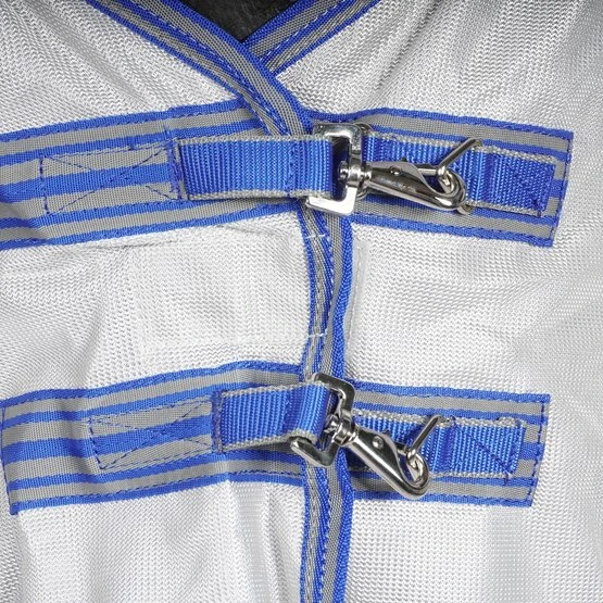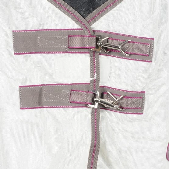 Der Weatherbeeta Comfitec Airflow II Combo-Hals besteht aus weichem, strapazierfähigem Polyesternetz und verfügt über eine neue Ultra-Bauchklappe und eine vollständig umwickelte Heckklappe für erstklassigen Schutz. Darüber hinaus verfügt die Decke über einen elastischen Einsatz am Widerrist für zusätzlichen Komfort beim Weiden. Der Ezi-Clip-Frontverschluss und der traditionelle Seitenzwickel für natürliche Bewegung vervollständigen die Decke. Die Schultern sind weich mit gepolstertem elastischem Nylonmaterial gepolstert. Die Mähne und die Heckklappe sowie das Gummiband sind ebenfalls mit Nylonmaterial ausgekleidet. Die Decke hat verstellbare und abnehmbare Beinriemen. Darüber hinaus bietet die Decke 70% UV-Schutz.